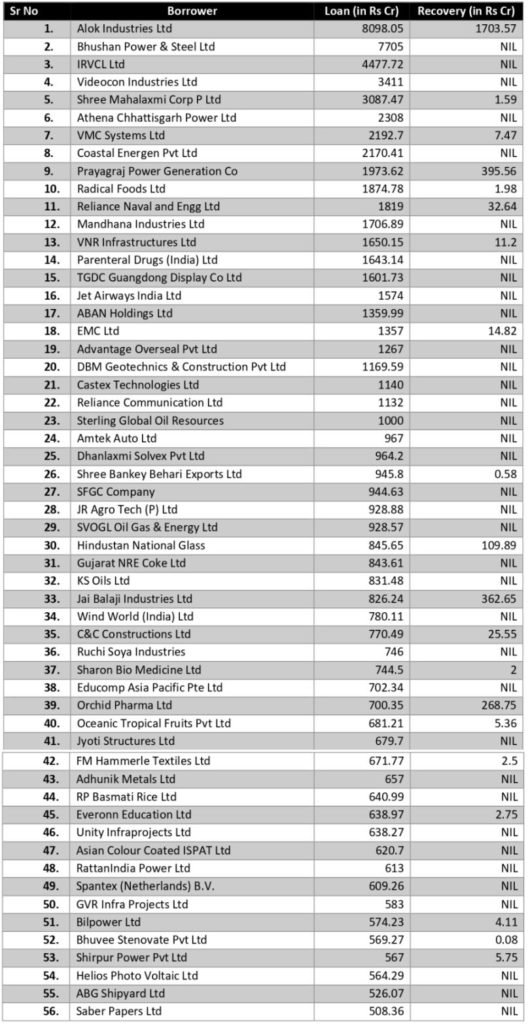 இவ்வளவு பெரிய கடன்களை வாங்கி கட்டாமல் ஏமாற்றியவர்கள் யார்? கடனில் டிராக்டர் வாங்கி அதனை திரும்ப செலுத்த முடியாமல் தற்கொலை செய்து கொண்ட விவசாயியா? கல்விக் கடன் வாங்கி படித்து விட்டு வேலை கிடைக்காமல் தேங்காய் மண்டியில் வேலை பார்க்கும் தம்பியா? சொத்துக்களை அடகு வைத்து கடன் வாங்கி அதில் டெக்ஸ்டைல் மில் கட்டி சந்தையில் படையெடுத்த மலிவு விலை சீன தயாரிப்புகளோடு போட்டி போட இயலாமல் சொத்துக்களை கடனில் மூழ்க விட்டு சுவற்றில் ஒடிந்து போய் அமர்ந்திருக்கும் அண்ணாச்சியா? இவர்கள் யாரும் இல்லை. வங்கி பணத்தை ஏமாற்றிய கேடிகள் அனைவரும் மிகப்பெரிய, புகழ்பெற்ற கார்ப்பரேட் நிறுவனங்கள். வங்கி அதிகாரிகளை கைக்குள் போட்டுக்கொண்டு திட்டமிட்டு ஏமாற்றியிருக்கிறார்கள். கீழே உள்ள படத்தை நன்கு கவனிக்கவும். அலோக் இன்டஸ்ட்ரீஸ், பூஷன் பவர், வீடியோகான், அனில் அம்பானியின் RCom முதலான பெரிய பெரிய கார்ப்பரேட் ராட்சதர்கள். ஒவ்வொரு நிறுவனமும் குறைந்தது 500 கோடிகள் கடன் வாங்கி ஏப்பம் விட்டிருப்பார்கள்.