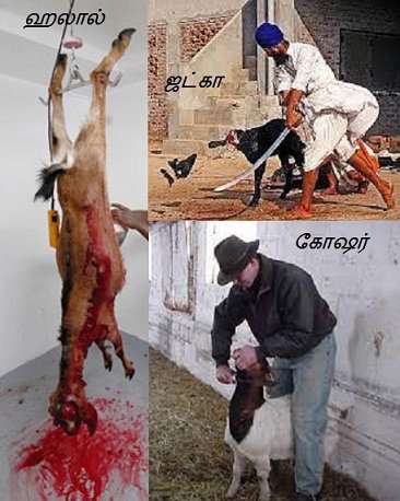 ஹலால் முறையில் கொஞ்சம் கொஞ்சமாக வலியால் துடித்து இறக்கிறது மிருகம்.கழுத்து நரம்பை அறுத்து ரத்தம் சொட்டச் சொட்டக் கொல்வதே ஹலால்.